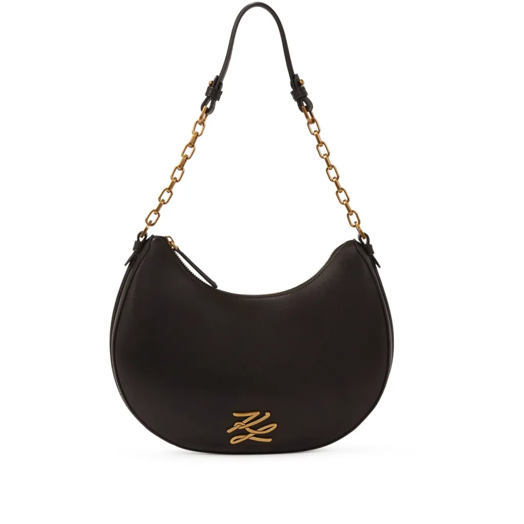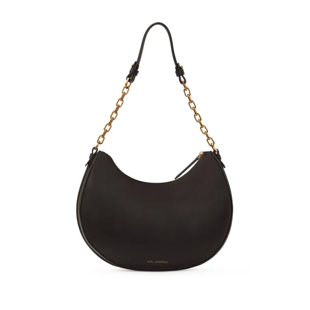 Defined by a contemporary moon-shaped silhouette, this KARL LAGERFELD shoulder bag brings modern elegance to any look. Crafted from soft 100% cow leather, it offers a smooth, luxurious feel while maintaining a structured yet feminine shape._x000D_