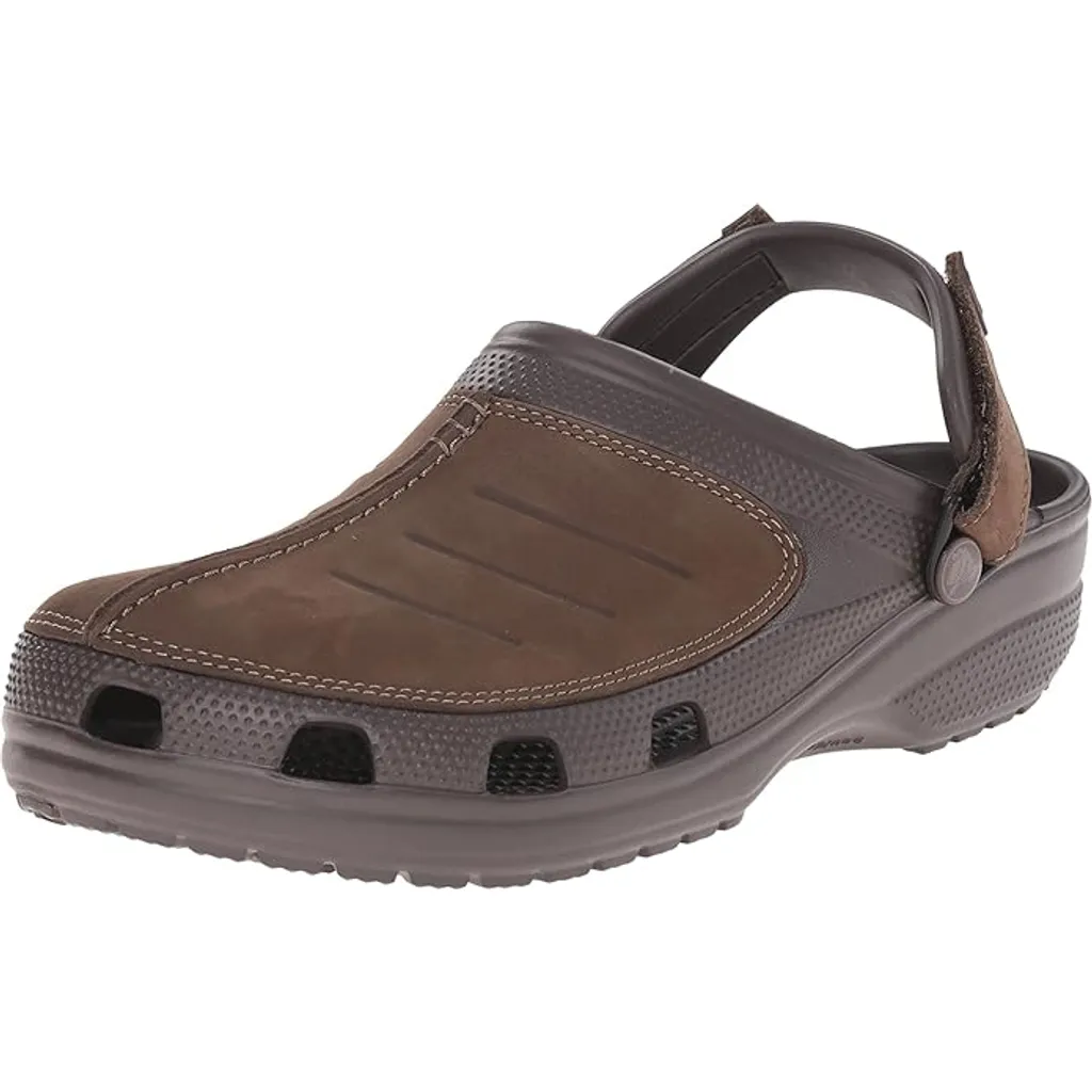 Designed for the outdoors, these men’s rugged clogs feature a dark brown finish with leather-styled detailing. The adjustable heel strap ensures a secure fit, while the sturdy sole provides excellent traction for varied terrains.