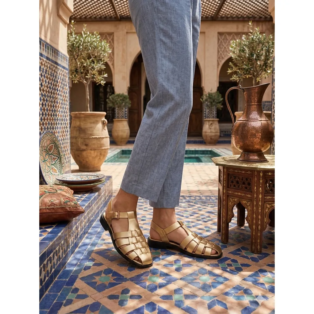 • Design: Multi-strap fisherman style in a vibrant metallic finish with an adjustable ankle buckle.Styling Tip: Let these be the focal point of your outfit by wearing them with an all-white linen ensemble.