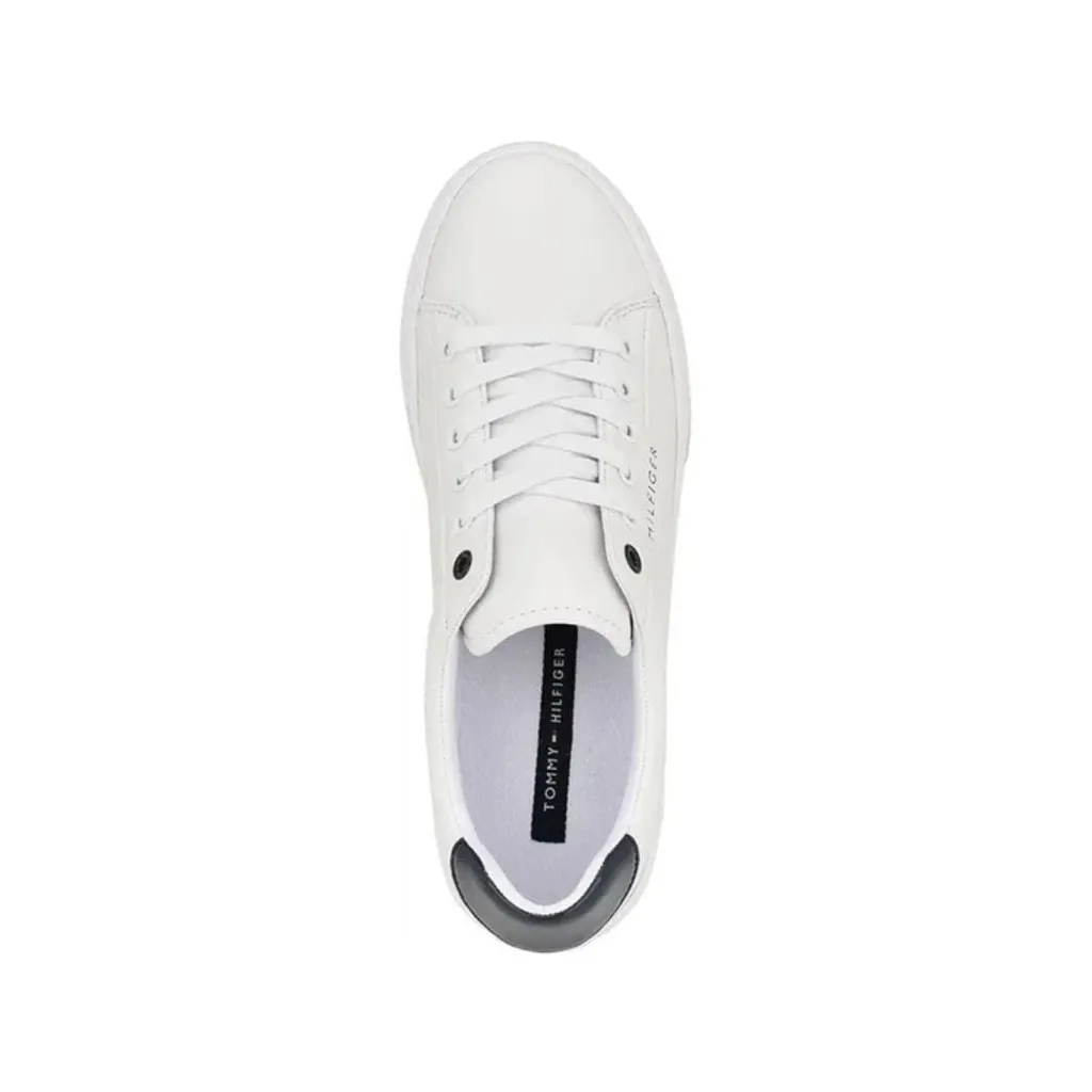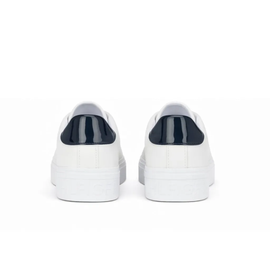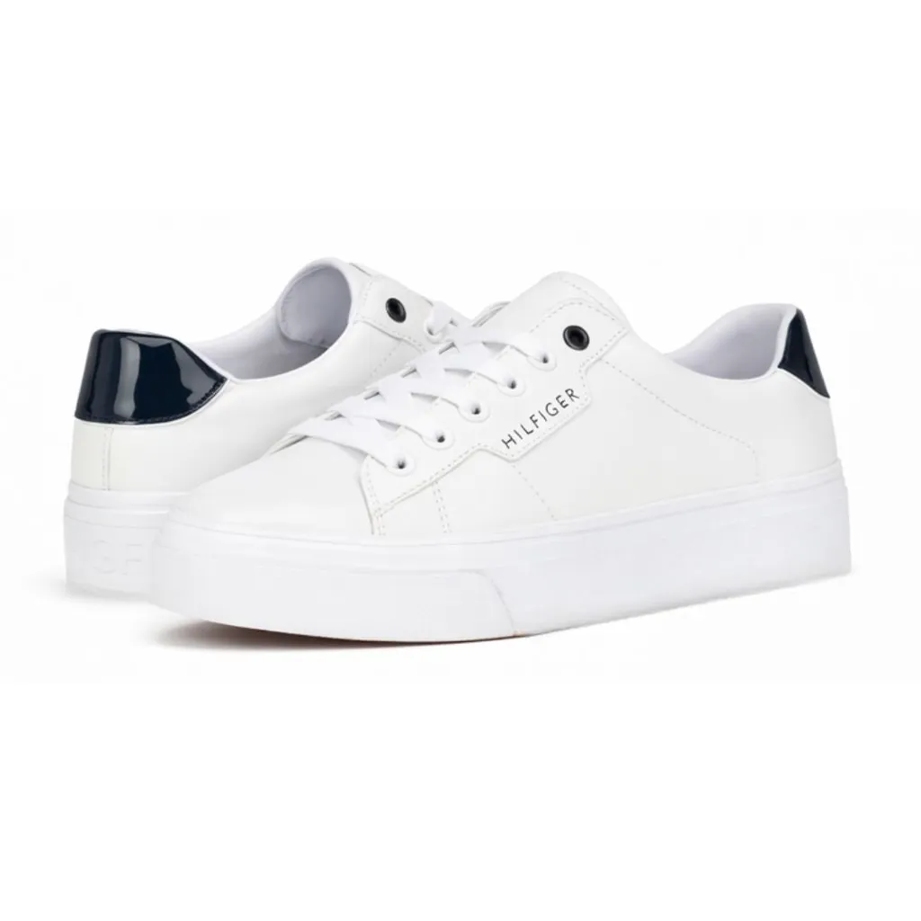 These clean and modern low-top sneakers feature a timeless minimalist design that delivers effortless everyday style. Crafted with a smooth synthetic leather upper, they offer a sleek and polished look enhanced by subtle HILFIGER branding on the side for a refined signature touch. The lace-up closure ensures a secure, adjustable fit, while the cushioned insole provides reliable comfort and support throughout the day. A platform rubber sole adds a gentle lift without compromising stability, complemented by a durable rubber outsole with textured grip for confident traction. Finished with a padded collar and tongue for added ankle comfort, this versatile pair transitions seamlessly between casual outfits, jeans, dresses, and athleisure looks, making it ideal for daily wear, city walks, and relaxed weekend styling.