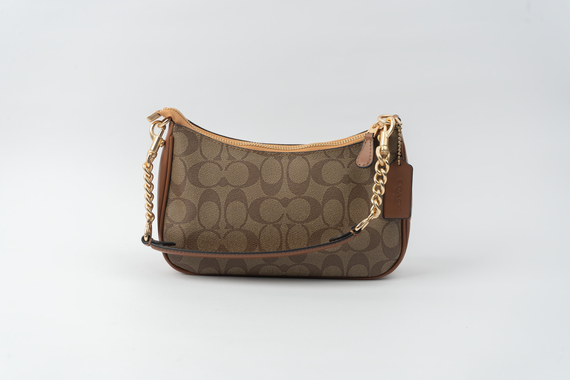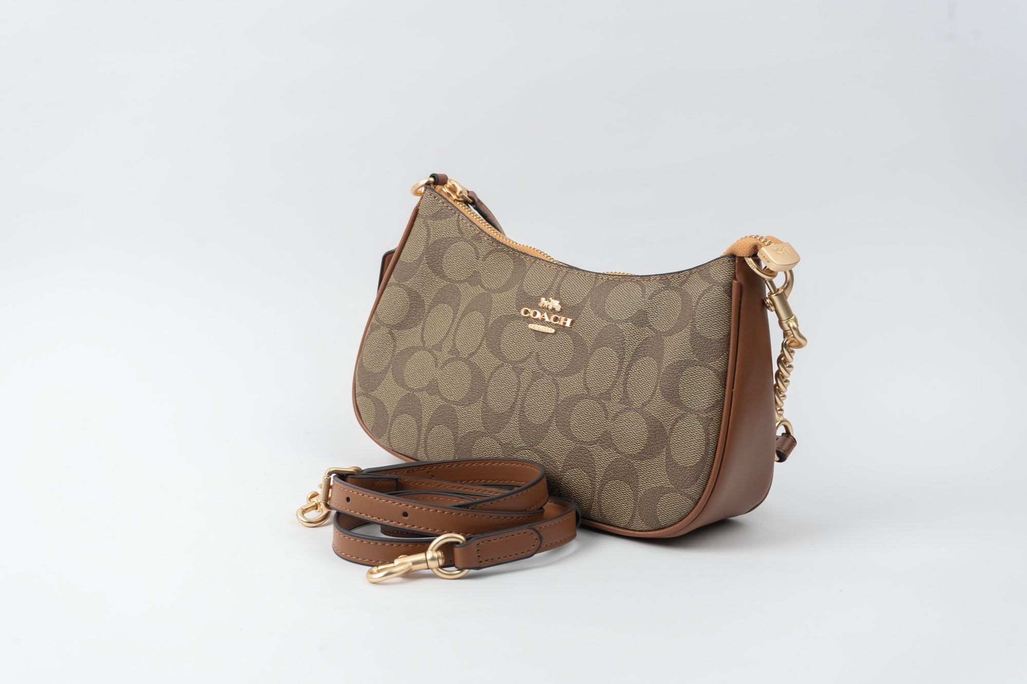 Iconic, compact, and effortlessly elegant — the Coach Teri Mini Crossbody Bag in Signature Canvas perfectly captures timeless sophistication with a modern edge. Crafted from the brand’s signature coated canvas in classic brown tones, this mini crossbody offers both durability and refinement. The zip-top closure ensures security for your essentials, while the detachable strap allows for flexible wear as a shoulder bag or sleek clutch. Its well-balanced proportions and heritage-inspired monogram pattern give it an elevated designer presence suitable for every occasion.