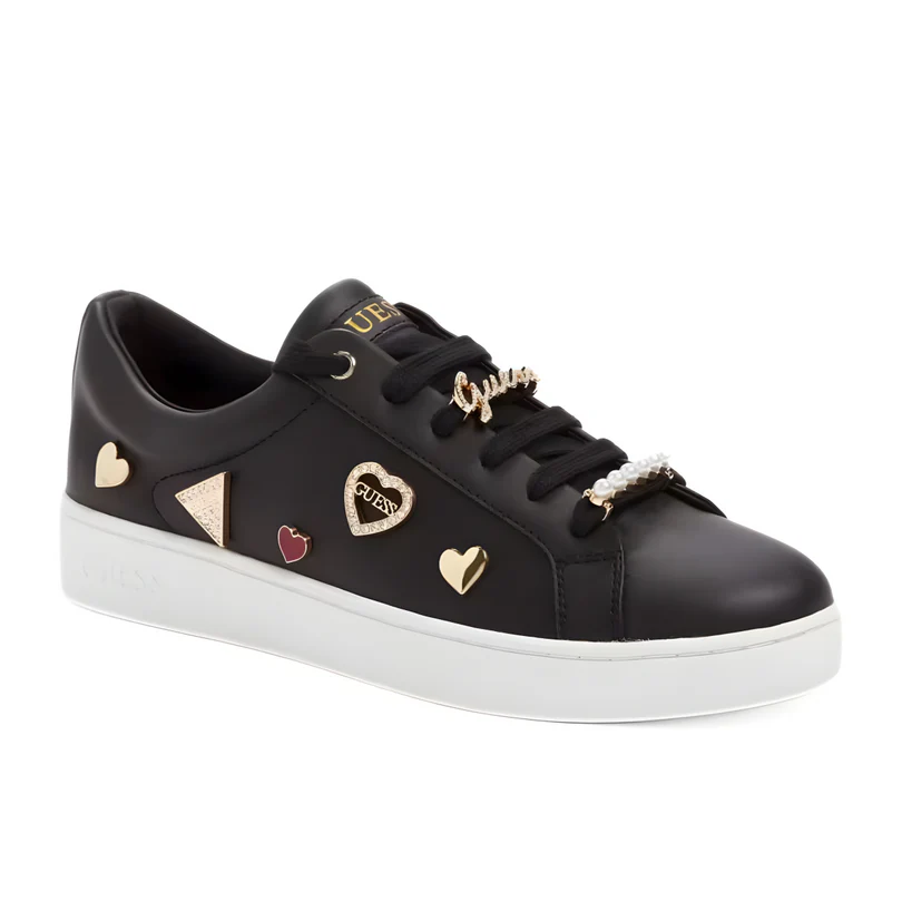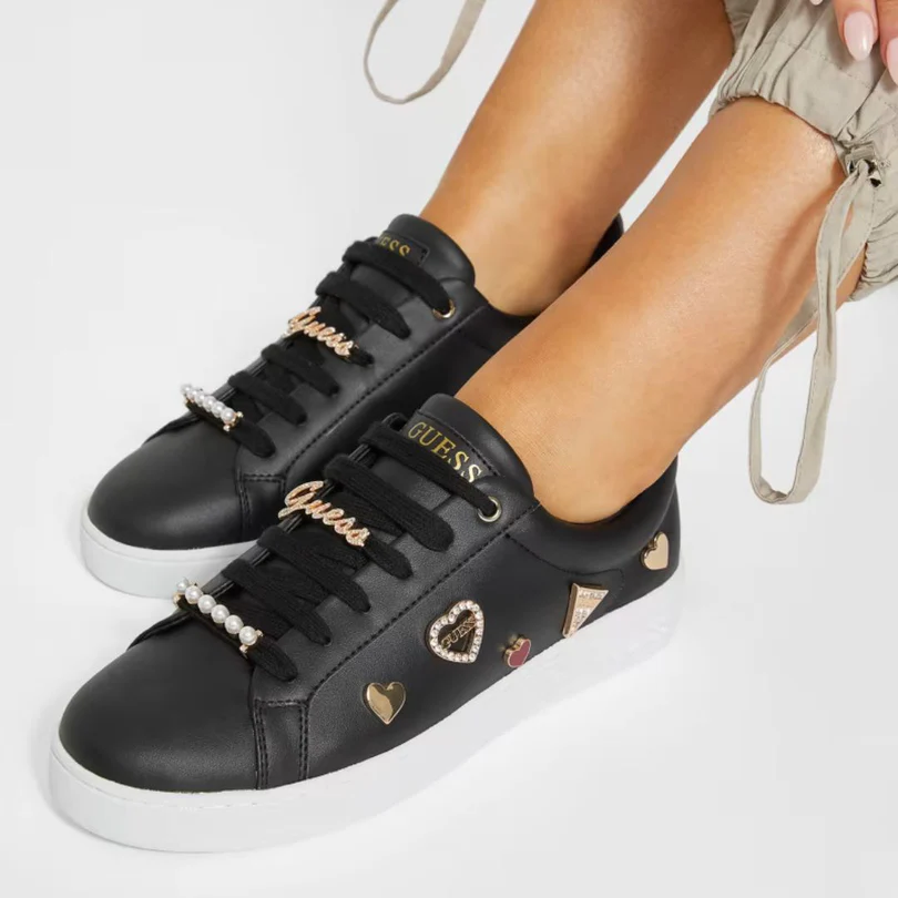 - The GUESS® Breaks sneaker is a great addition to your casual closet. This lace-up sneaker features a classic sporty silhouette and is decorated with charms and pins that feature the iconic logo and heart details. This shoe adds just the right amount of flair to a wardrobe staple.