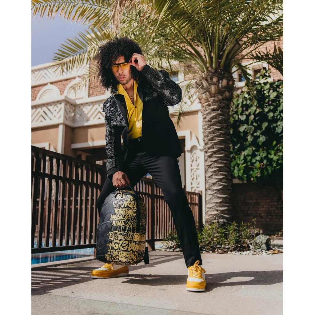 The exterior features multiple storage options, including a front zipper pocket, side pockets, and a zippered stash pocket for quick access. A separate velour-lined sunglass compartment offers added protection, while gold-tone zippers and a metal “Sprayground Authentic†badge enhance the premium finish. The slide-through back sleeve conveniently attaches to carry-on luggage for hands-free travel._x000D_
