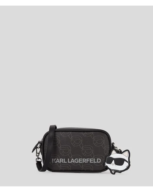 This statement camera bag features a compact design with a secure zip-top closure. The all-over IKON monogram design and playful Choupette hanging charm add eye-catching detailing while the detachable crossbody strap ensures versatile styling. Colour: black
