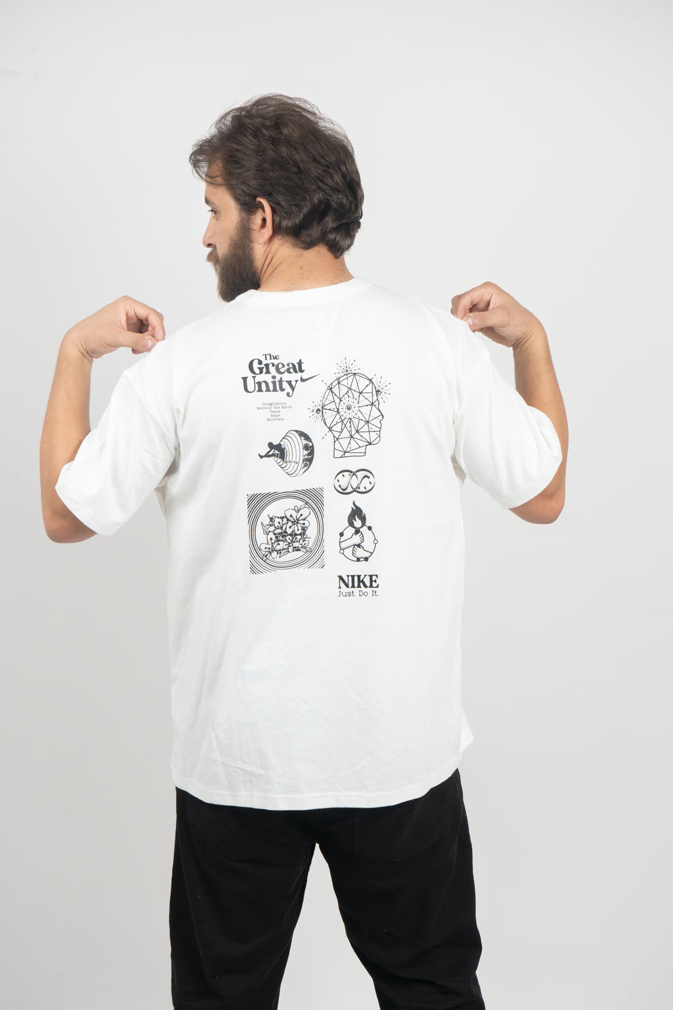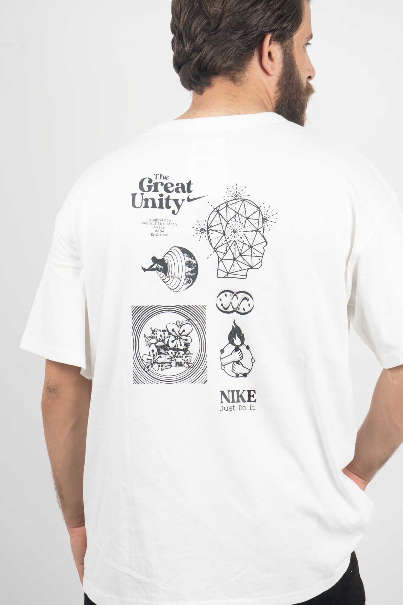 Inspired by imagination, connection, and self-expression, the Nike “The Great Unity” Graphic Tee blends iconic design with modern art. The front keeps it subtle with the signature Nike Swoosh, while the back steals the spotlight with intricate monochrome illustrations and motivational “Just Do It” text. The result — a perfect balance of simplicity and creativity.