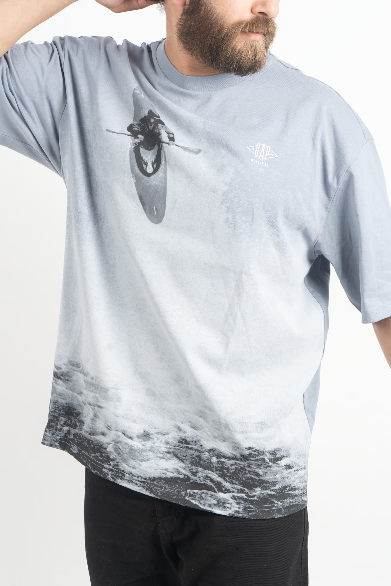 This effortlessly cool oversized tee captures the dynamic spirit of adventure with a high-impact graphic: a bold depiction of a kayaker plunging into swirling white water, set on a soft grey backdrop. The gradient effect—from misty grey at the chest down to the foamy sea at the hem—creates a sense of motion and energy that transforms the shirt into more than just apparel—it’s a statement.
