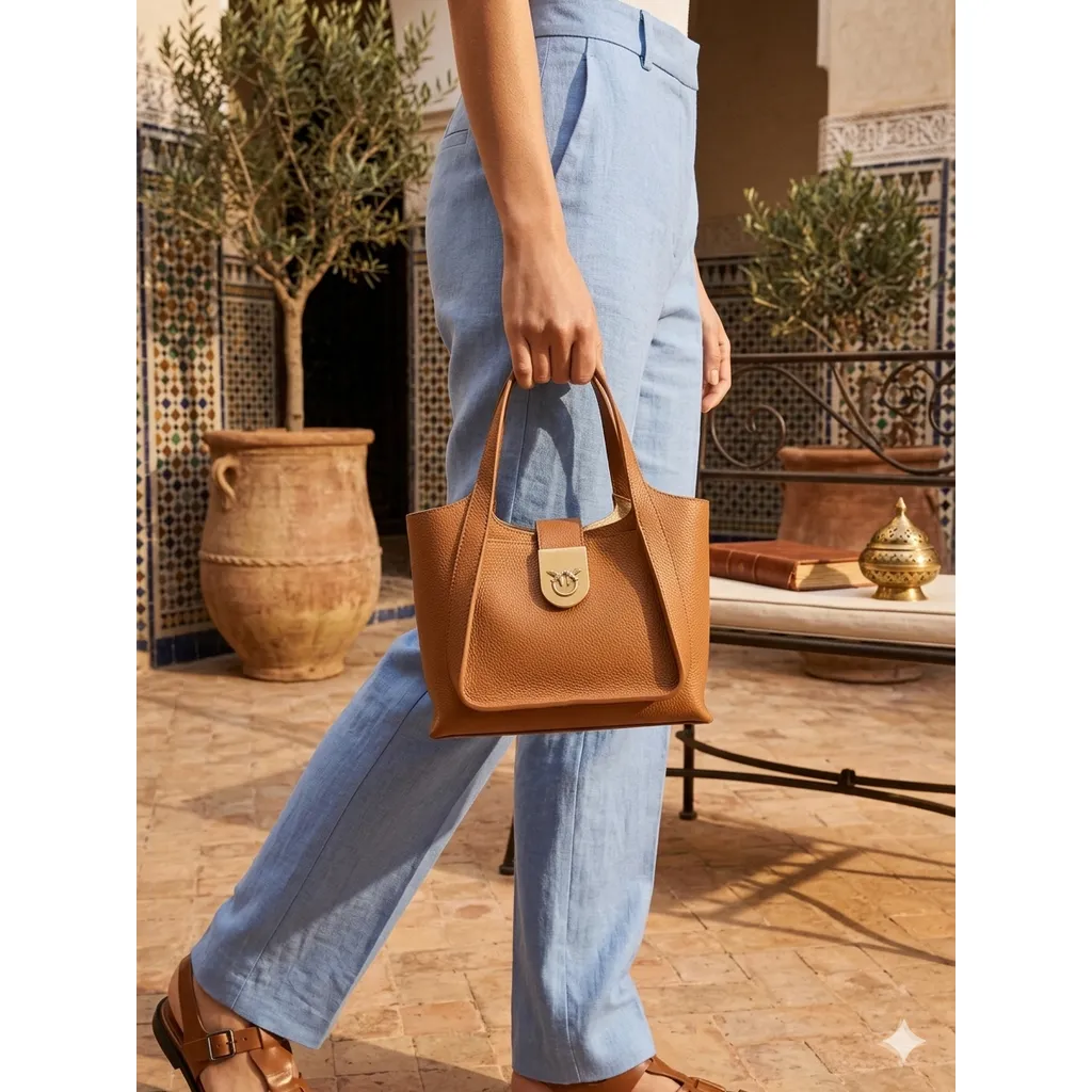 "A compact and stylish version of the classic Pinko tote in a rich tan hue. The pebble-grain finish and iconic interlocking birds metal buckle make it a versatile accessory for both casual and semi-formal outings.
