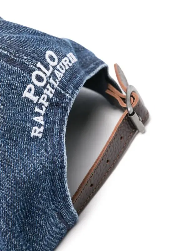 medium blue cotton washed denim curved peak six-panel construction signature Polo Bear motif embroidered logo to the rear eyelet vents leather strap