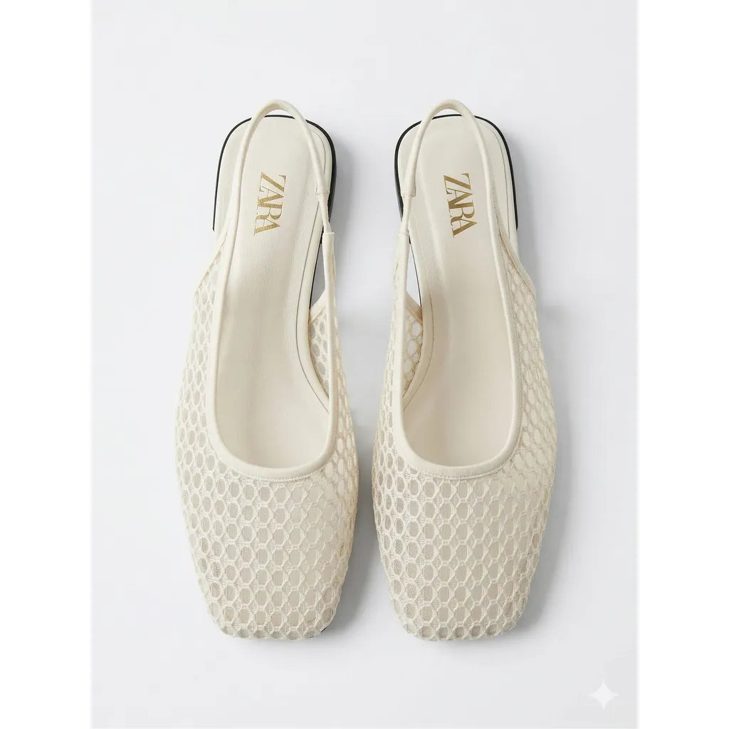 Elegant and airy, these cream-colored flats feature a delicate woven texture and a modern square toe, providing a chic alternative to standard pumps.