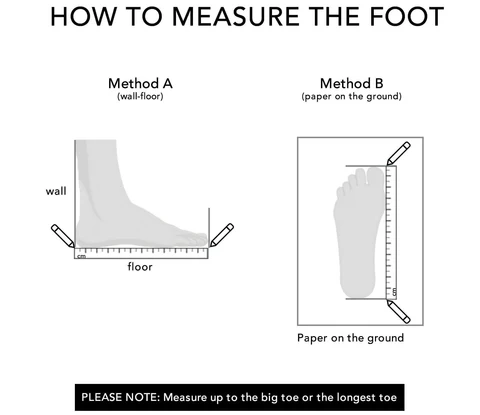 Using a pencil and a ruler, once you have traced the mark from the heel to the big toe or, to the longest toe, take the measurement and then compare it with the size chart. This gives you the length of your foot in centimeters (Cm).